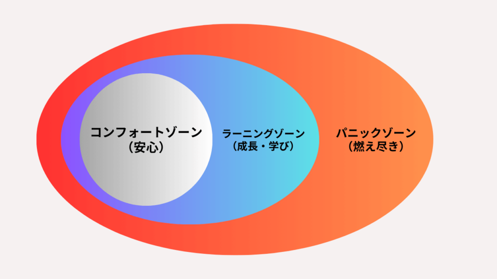 ラーニングゾーンは先程も触れましたが、成長・学びの領域で、同時に痛みも伴います。